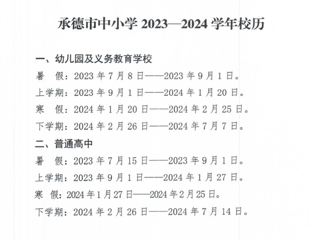 据承德晚报微信公众号消息:1月5日,记者从承德市教育局获悉,根据安排,幼儿园及义务教育学校放假时间为1月20日;普通高中放假时间为1月27日。
