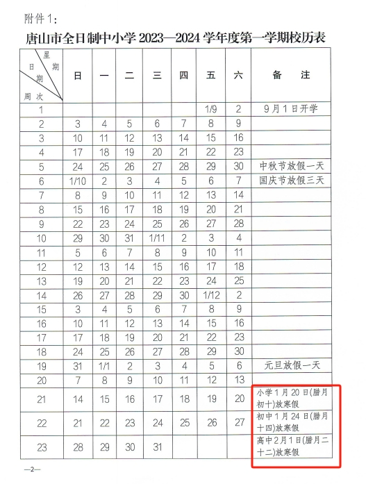 唐山校历中放假时间:2023-2024学年度校历,唐山市中小学寒假时间安排为, 小学1月20日放寒假,初中1月24日放寒假,高中2月1日放寒假,2月26日开学。