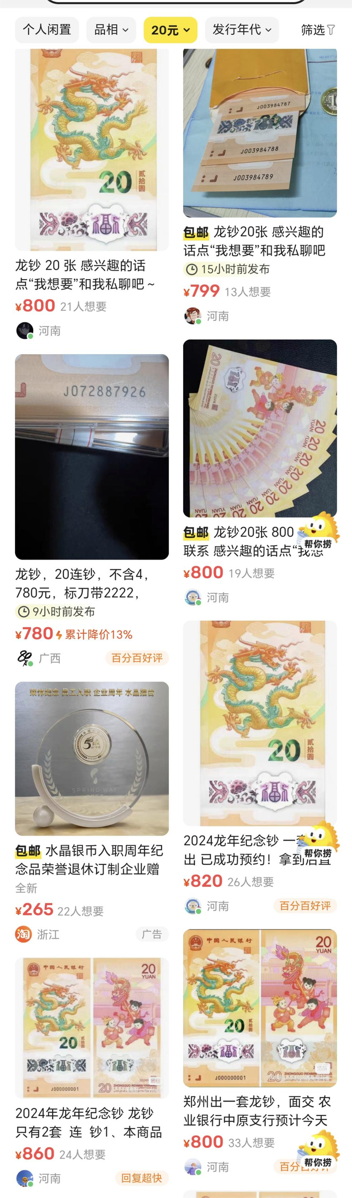 记者通过闲鱼等平台搜索“龙钞”词条发现,有不少网友在网上售卖“龙钞”“龙币”。截至1月13日,按总面值400元(20张面值20元)一套的“龙钞”计算,“炒价”在700元至800元;按总面值200元(10张面值20元的)一套的“龙币”计算,“炒价”高达600多元。