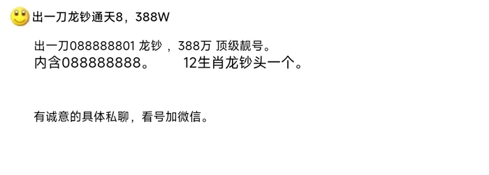 在采访中,记者也从一位钱币收藏业内人士那里了解到,目前确实在钱币收藏圈,有人发出消息,“出一刀088888801龙钞,388万顶级靓号,内含088888888。”