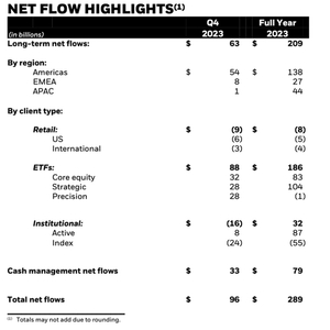 当地时间2024年1月12日,贝莱德集团发布的2023年4季度财务报告显示,截至2023年12月31日,贝莱德集团资产管理规模约为100090亿美元,再度突破10万亿美元。2023年全年资金净流入2890亿美元,其中四季度净流入为960亿美元。截至2022年12月31日,贝莱德集团的资产管理规模为85945亿美元。2023年贝莱德集团资产管理规模增长16%。