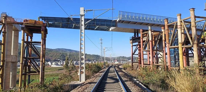 近日,经过420分钟的顶推施工,由中铁八局承建的大理至南涧高速公路凤仪立交E、G匝道两幅钢箱梁同步推移37米,顺利跨越广大铁路,精准就位。