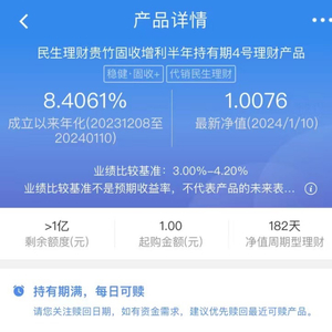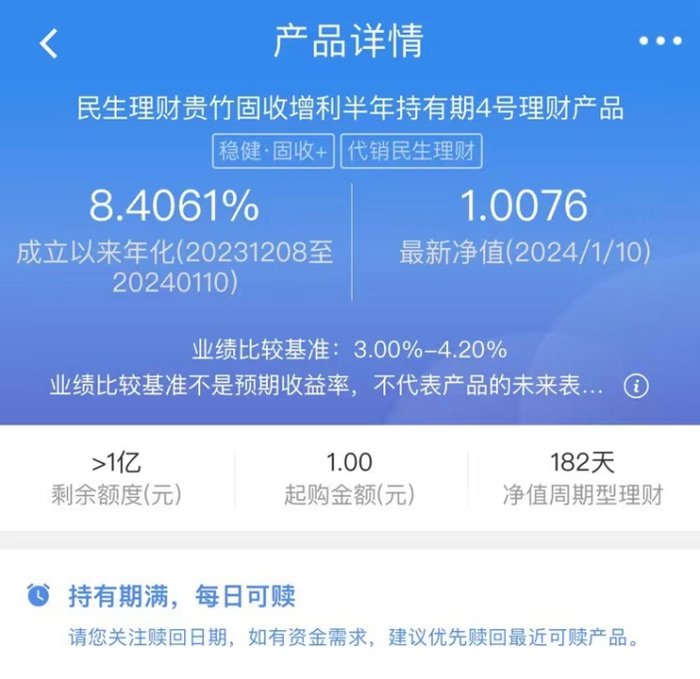 记者注意到,民生理财于2023年12月份发行的一款半年持有期固收类理财产品,成立以来年化收益率达8.4%,该产品近一个月年化收益率更是高达9%。