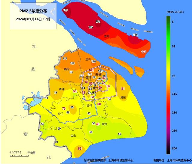 1月14日,上海市发布空气重污染黄色预警,图为17时PM2.5浓度分布。