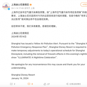 1月14日17时48分,上海迪士尼度假区官方微博发布消息称,上海市已发布空气重污染黄色预警。按“上海市空气重污染专项应急预案”的相关要求,上海迪士尼乐园将对今天的运营安排进行临时调整,包括今晚的“奇梦之光幻影秀”夜间演出将不包含烟花效果。