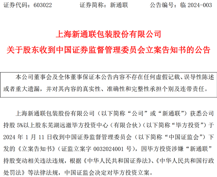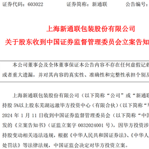 1月12日,新通联公告,公司获悉持股5%以上股东芜湖远澈毕方投资中心(有限合伙)(以下简称“毕方投资”)于2024年1月11日收到中国证监会下发的《立案告知书》。因毕方投资涉嫌新通联持股变动相关违法违规,中国证监会决定对毕方投资立案。
