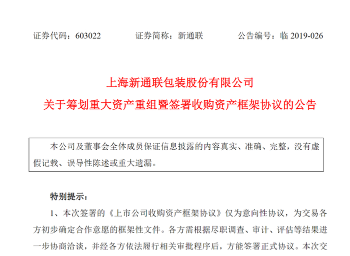 2019年10月25日,新通联发布了筹划重大资产重组暨签署收购资产框架协议的公告。