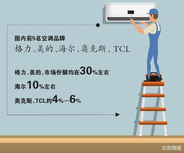 长期以来,排在前5名的空调品牌是格力、美的、海尔、奥克斯、TCL,综合各家机构统计数据看,格力、美的双雄并峙,其国内市场份额均在30%左右,海尔的市占比稍逊,约在10%左右,奥克斯、TCL的市占比约在4%—6%。除了传统老牌家电外,包括小米在内的新兴企业,通过AIoT方面的布局,也杀进了空调赛道,占据一席之地。