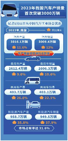 1月11日,中国汽车工业协会公布的数据显示,2023年我国汽车产销分别累计完成3016.1万辆和3009.4万辆,汽车产销量创出新高。自此我国汽车产销总量连续15年稳居全球第一。