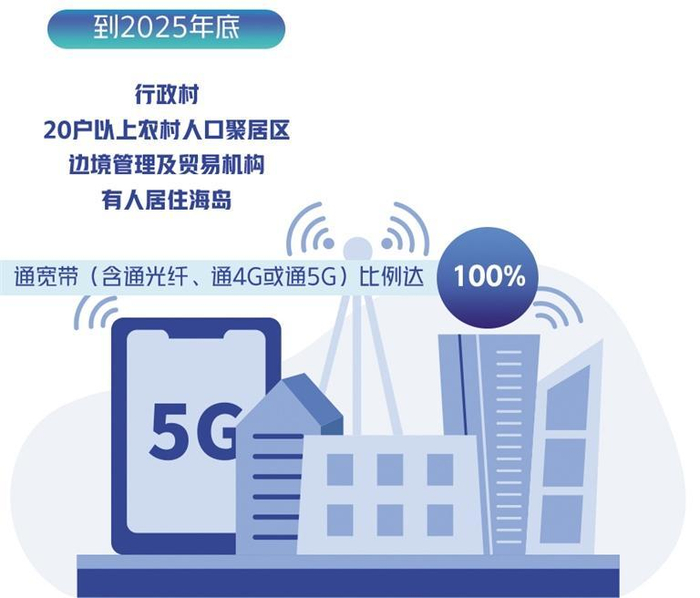在乡村层面,要促进边疆地区乡镇政府驻地、行政村宽带向千兆光网升级,灵活采用中频和低频5G基站,逐步推进5G网络向农村地区延伸覆盖。探索偏远地区分散用户宽带接入技术和组网方案,加快推进20户以上农村人口聚居区、抵边新村、林场/农场/牧场驻地等场景宽带网络覆盖。