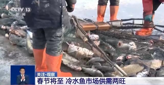 而在冷水鱼货源地之一的东北,大庆的冬捕活动进入高潮,2000多米的大网缓缓升起,这一网最大的鱼有30多斤。