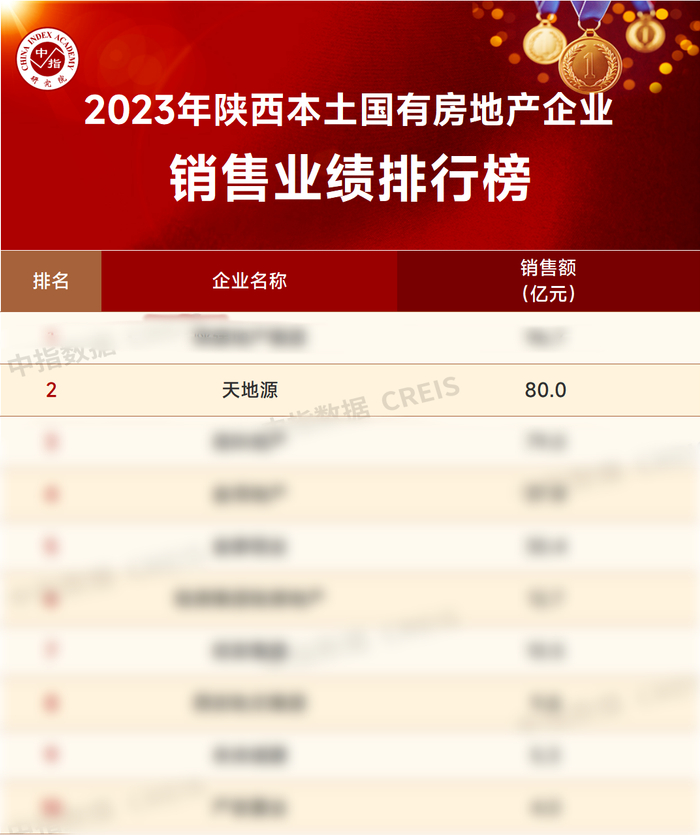 根据此前中指研究院发布的数据,天地源超额完成全年业绩目标,完成率108.4%。同时在《2023年陕西本土国有房地产企业销售业绩排行榜》中,以80亿元的销售额位居第二。