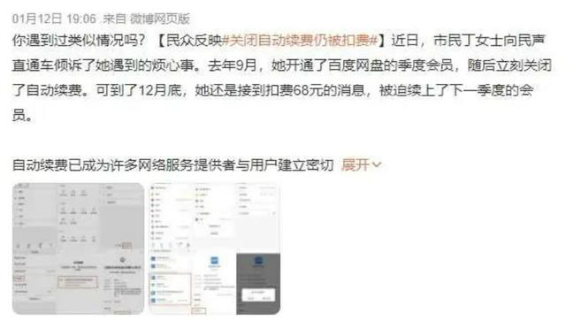近日,“关闭自动续费仍被扣费”的话题登上热搜。一网友在2023年9月开通了某网盘的季度会员,随后立刻关闭了自动续费。可到了12月底,她还是接到扣费68元的消息,被迫续上了下一季度的会员。