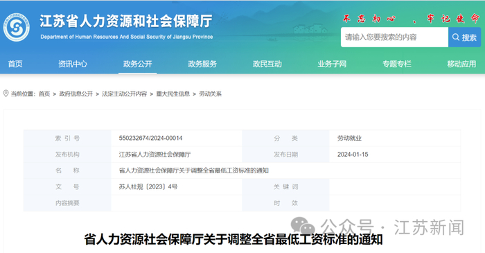 江苏省人力资源和社会保障厅1月15日下发通知,根据《最低工资规定》(原劳动保障部令第21号)和《江苏省工资支付条例》规定,经省人民政府同意,从2024年1月1日起调整全省最低工资标准