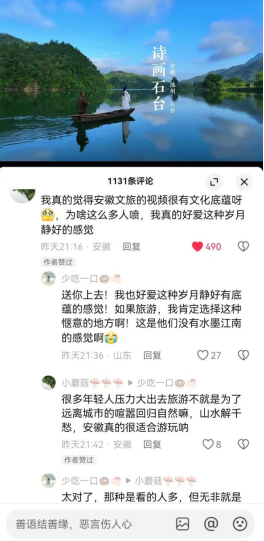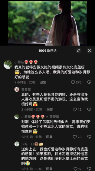 网友纷纷留言“安徽人文底蕴深厚,山水人文就是我们最大的招牌,主打一个诗情画意”“安徽就要这么徽风皖韵的感觉,我喜欢这种岁月静好”“安徽文旅厚积薄发,超喜欢这种娓娓道来的调调”“跟着李白游安徽,去看诗情画意的安徽”。