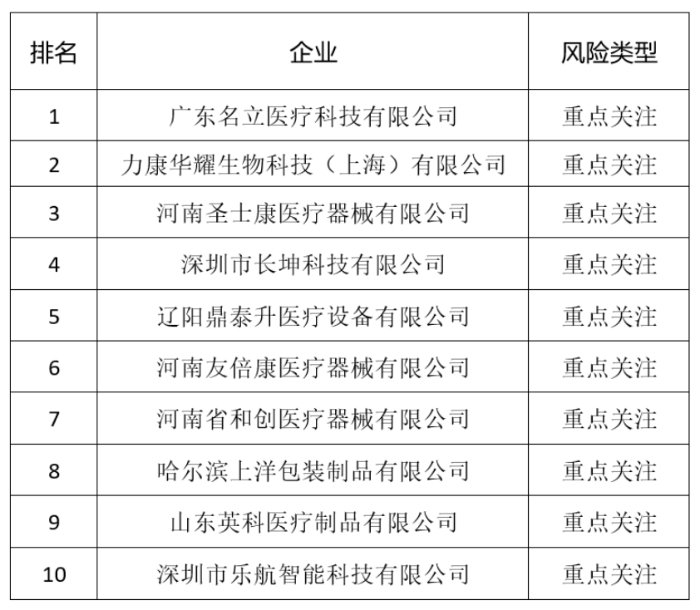 中国食品药品网讯(记者闫若瑜) 近日,中国健康传媒集团舆情监测中心发布冒烟指数Top10之医疗器械企业(2024年第一期),公开风险指数排名前十的企业。广东名立医疗科技有限公司(以下简称广东名立)、力康华耀生物科技(上海)有限公司、河南圣士康医疗器械有限公司、深圳市长坤科技有限公司、辽阳鼎泰升医疗设备有限公司、河南友倍康医疗器械有限公司、河南省和创医疗器械有限公司、哈尔滨上洋包装制品有限公司、山东英科医疗制品有限公司、深圳市乐航智能科技有限公司位列前十名,均为“重点关注”企业。