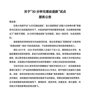 有关该服务的适用范围,彭湘伟称,目前只能是特定影院、特定影片,艺术类电影可能不适用,不能30分钟内无限制退票。但他预计,到春节档阶段能服务全国超1000家影院。