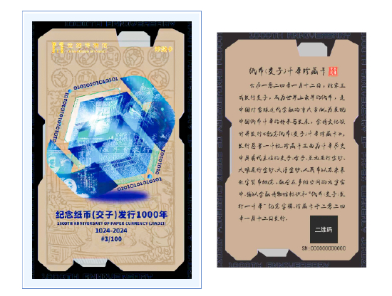 回溯千年交子文化历史,串联当下金融科技前沿,为展现中国纸币千年的传承与发展,金博文化设计并发行《纪念纸币(交子)千年数字珍藏卡》,发行总量一千枚;纪念(交子)发行1000年龙纹纪念券也同期线上发售。该数字珍藏卡经开通后即可拥有金融博物馆智能数字身份,持续享有博物馆赋能的服务体验。2024年正值甲辰龙年,此次发行的纪念券以中华民族的经典代表性图腾“龙”为主元素,既承载着人们美好的期盼,又寓意弘扬中华民族血脉中的创新精神。该纪念券采用多种防伪技术印制,具有代表性的纸币钞版以及未来数字货币概念。