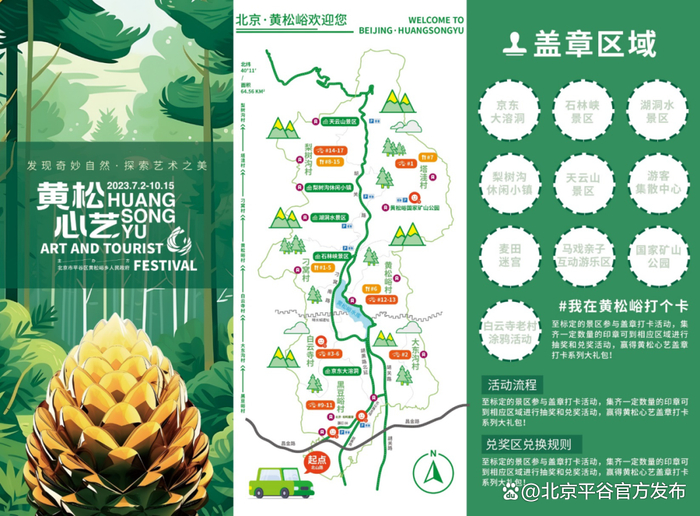 2023北京平谷黄松峪艺术休旅季 (大地艺术节)项目联合中央美院及世界各地21位著名艺术家,在以乡为行政区域内创作了23个大型室外装置艺术,同时集合乡内5个著名景区,联合当地众多餐饮民宿,打造黄松峪艺术休旅季,在黄松峪全域内设立广告宣传,设计制造文创产品,设立以黄松峪为主体的微信、抖音、小程序、美团、携程等平台账号,拍摄文化艺术宣传片等宣传渠道,整合地区文化旅游资源,提高区域整体文化旅游竞争力,丰富文化旅游资源,同时加入马戏杂技演出团体,乐队舞蹈等活动,汉服传统文化展示,文创市集、餐饮市集等商业及公益表演。
