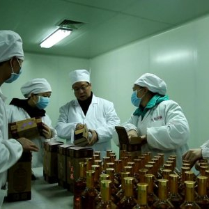工人将天麻酒进行装盒
