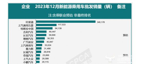 据乘联会数据显示,2023年12月,上汽通用五菱新能源乘用车批发销量为117533万,特斯拉中国、吉利汽车和长安汽车分别为94139辆、60447辆和59000辆。