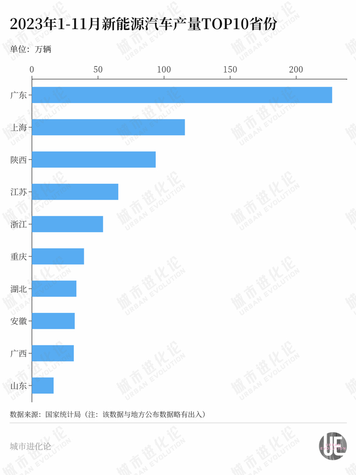 然而,从国家统计局公布的新能源汽车产量看,2023年1-11月,广东、上海、陕西、江苏、浙江分列全国前五,山东则以16.42万辆,仅排在全国第10。