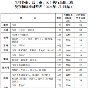 据江苏省人力资源和社会保障厅,调整后,江苏一类地区月最低工资标准从原来的2280元上调到2490元;二类地区月最低标准从原来的2070元上调到2260元;三类地区从1840元上调到2010元。非全日制用工小时最低工资标准每个地区均上调2元,调整后:一类地区24元;二类地区22元;三类地区20元。