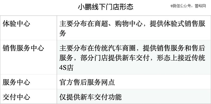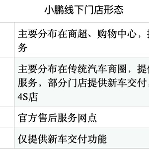小鹏有4种线下门店,其中销售服务中心最接近传统的4S店,也是这次渠道改革的主力。