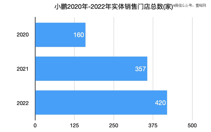 按照何小鹏在2023年第三季度的财报电话的说法,(2023年)年底小鹏总门店将达到500家,中长期目标建成500家集销售和服务为一体的综合店、1000家体验中心和卫星店。