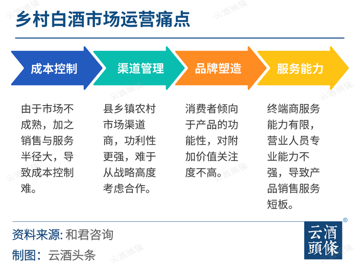 由于乡村市场幅员辽阔,终端售点分布非常分散,以及乡村消费水平偏低,商品利润空间有限,白酒企业在乡村市场运营过程中往往存在以下难题。