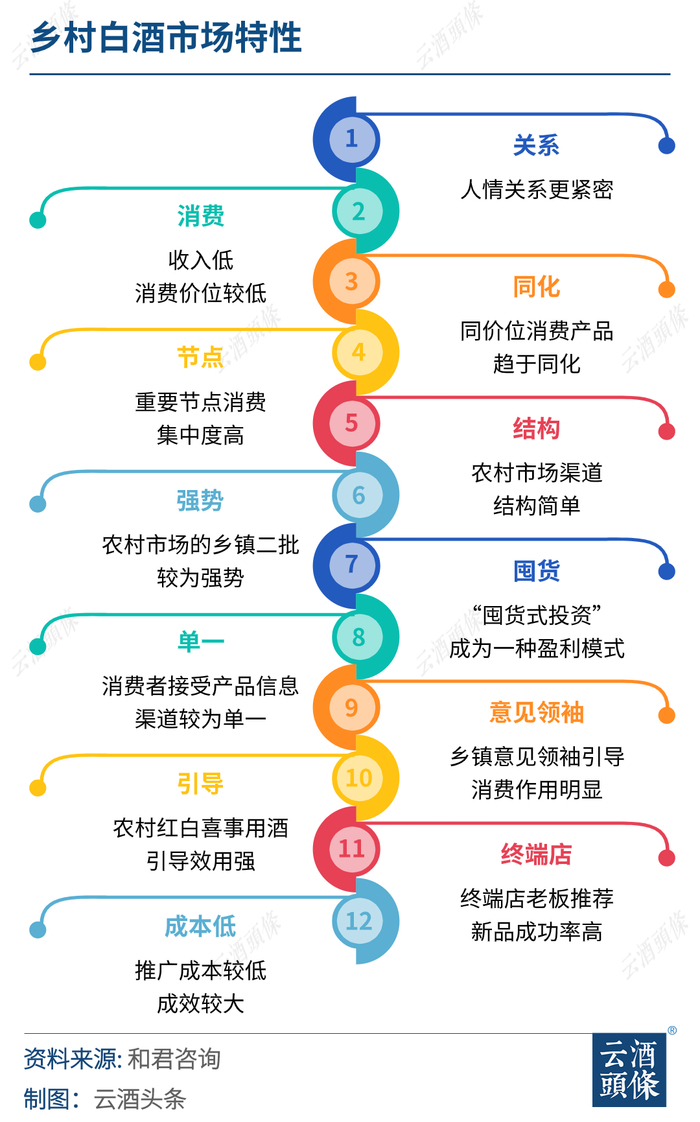 基于此,“乡村市场”的概念可归纳为:包含经济不发达的县城、乡镇以及基础行政村市场。其相较城市市场而言,终端网点分散、运距长、人均消费水平低,除此之外,乡村白酒市场还存在以下特性。