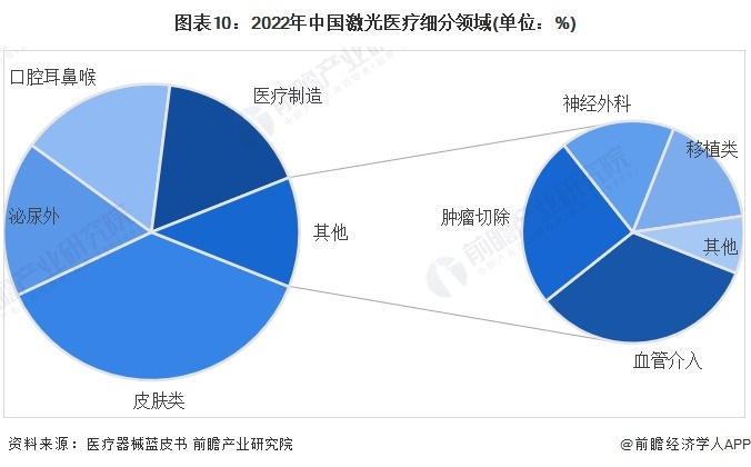 结合医疗器械蓝皮书数据,初步核算,2022年皮肤类仍然是激光医疗设备的主要应用领域,占比超过37%,其次是泌尿外、口腔耳鼻喉、医疗制造领域,这三个细分领域占比均为17%,其他领域占比低于4%。