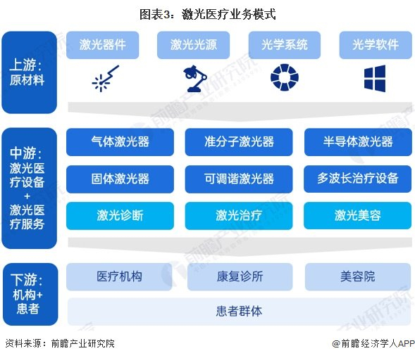 中游包括了激光医疗的产品系列,主要有分子激光器治疗仪系列、固体激光器治疗仪系列、半导体激光器治疗仪系列、准分子激光治疗仪、可调谐激光器治疗仪、多波长激光治疗仪及相关设备等。