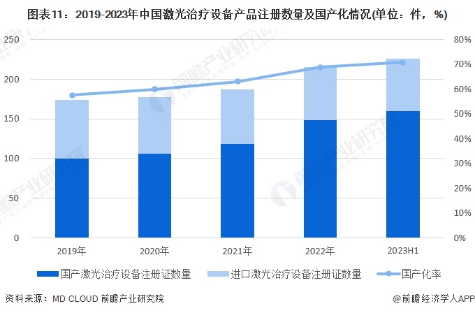 据MD CLOUD数据统计,2019-2022年国产激光治疗设备数量从100件上升至148件,进口注册证呈下降趋势,从74件下降到67件,国产化率从57.5%上升至68.8%。截至2023年上半年,激光治疗设备有效产品注册总数为226件,其中国产产品有160件,进口产品66件,国产化率为70.8%。