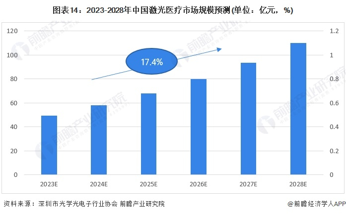 据中国医疗器械行业协会激光医疗市场调研显示,全国各主要医院目前大多已建立了激光医疗中心,且80%以上的医院配备了激光医疗设备。同时,很多中小型医院也建立了激光治疗室,国内医疗界对激光医疗设备的需求大大增加。未来,随着激光医疗设备的核心器件研发加快,海外企业占据主导的局面将发生变化。预计2023-2028年,中国激光医疗器械行业将保持17.4%年复合增长率增长,2028年将达到110亿元。
