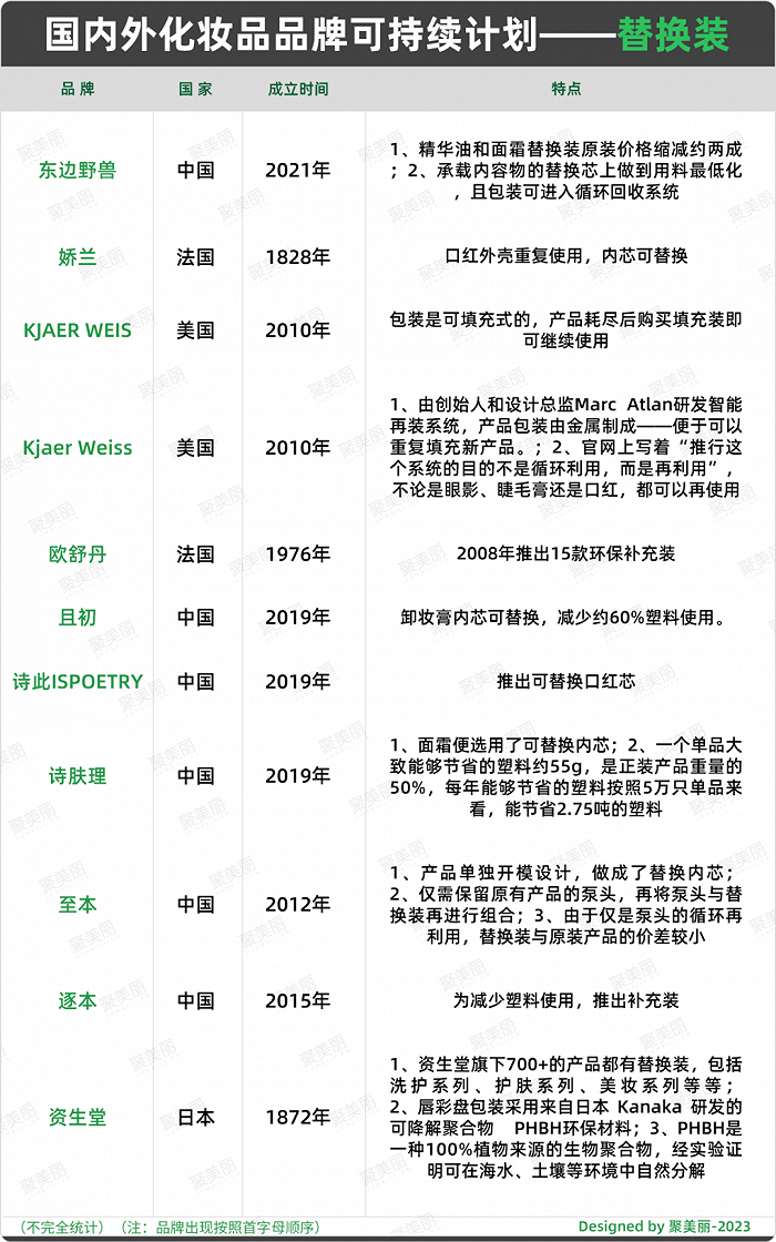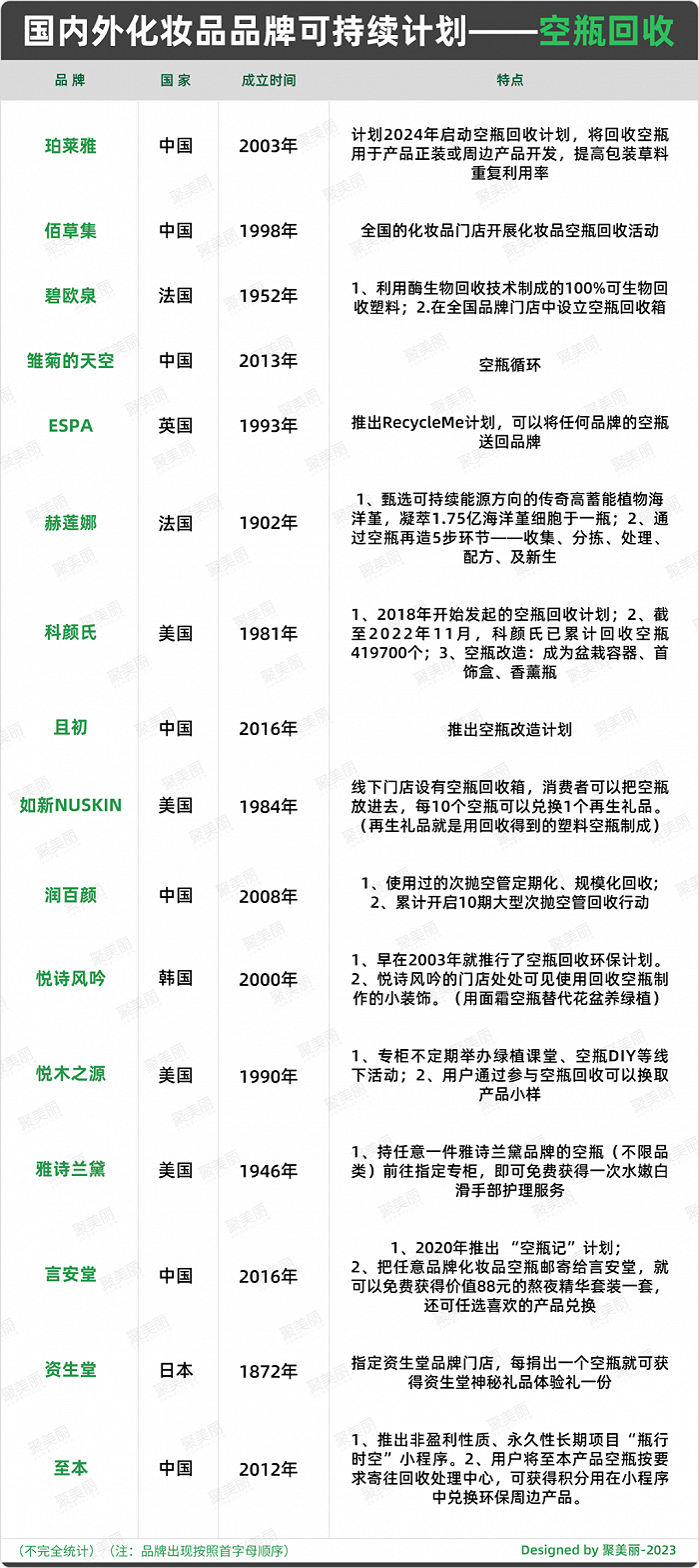 聚美丽发现,在可持续发展的行动中,产品包装是大多品牌会切入的点,如,国内外不少品牌都推出空瓶回收计划、环保包装、替换装等。