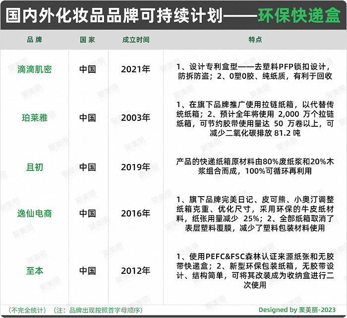 不仅如此,化妆品的可持续包装的多元化还延续到了快递物流端。在国内化妆品品牌中,包含且初、滴滴肌密、至本、完美日记、珀莱雅等在内,都在环保快递盒上有所举动。