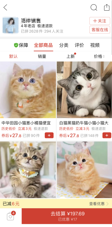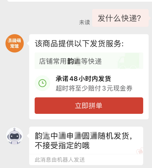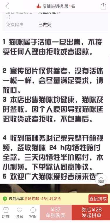 记者在某多平台搜索“活宠”,发现许多贩卖宠物的店家,记者随机进入一家销售店中发现,该店主要售卖2个月大的中华田园猫,售价在200元以内,店主明确表示“活体一旦出售,不退不换”。经询问,店主表示他们使用某达快递发货,并承诺若小猫在签收后24小时内死亡,将全额赔付,若在3天内死亡,则半价赔付。