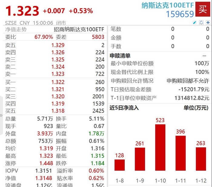 纳斯达克100ETF(159659)溢价走阔收涨0.53%,创上市以来收盘价新高,资金面持续火热,连续7日录得净流入