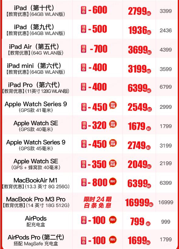 此外,iPad、MacBook、Apple Watch等全系Apple产品都能在京东享受更低的价格。其中,iPad产品至高优惠700元,MacBook Air至高优惠800元,Apple Watch S9至高优惠450元,AirPods多个型号领券限时优惠100元。