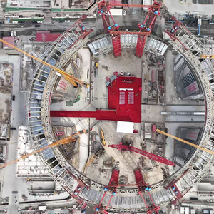 值得一提的是,超大直径、超大跨度空间钢结构,且截面呈开口形式,施工过程为非稳定体系,使得结构安装和变形控制难度很大。因此,在施工中项目团队采用了高空原位散件吊装与上海机施自主研发的整体提升工艺相结合的方法,实现数字化模拟和全过程实时监控。