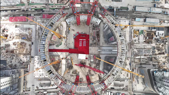 项目由上海机械施工集团有限公司(下称“上海机施”)实施。据上海机施介绍,“荣耀之环”环顶高度56.15米,圆环结构高度为6.6米,宽度14米,单跨跨度为120米,钢结构工程总重量1万余吨。