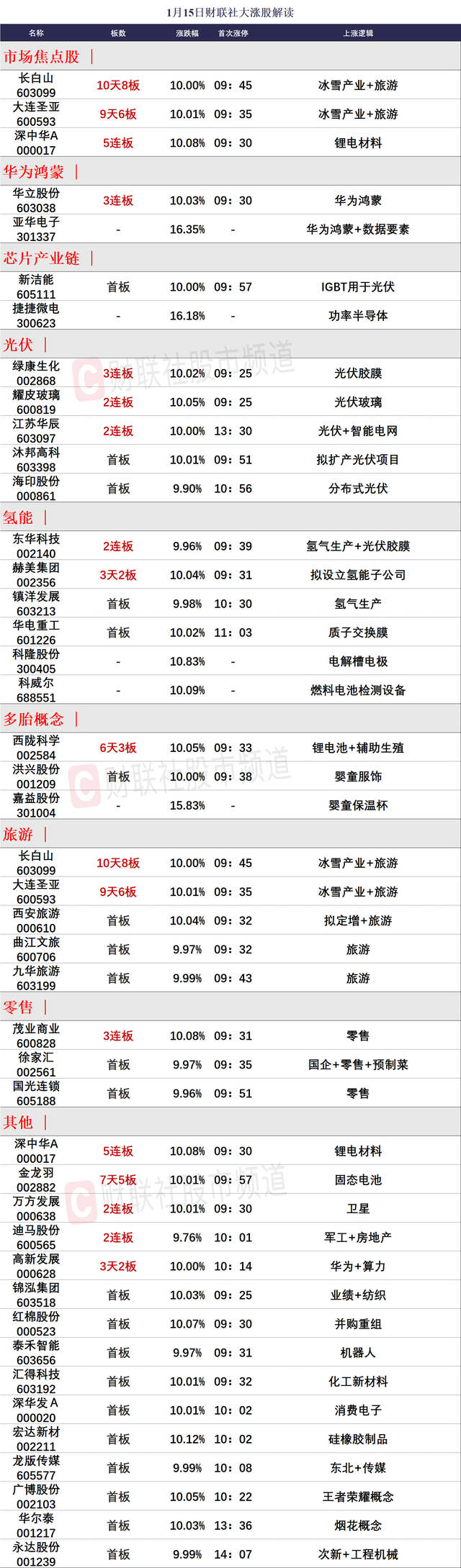 【1月15日涨停分析】今日共36股涨停,连板股总数9只,21股封板未遂,封板率为63%(不含ST股、退市股及未开板新股)。个股方面,旅游股长白山10天8板、大连圣亚9天6板,锂电池板块深中华A5板、金龙羽7天5板,光伏股绿康生化3板、耀皮玻璃2板,鸿蒙概念股华立股份3板,零售板块茂业商业3板,多胎概念股西陇科学6天3板,氢能板块东华科技2板、赫美集团3天2板。今日收涨个股1972只,收跌个股2895只。