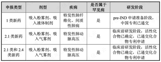 (1)据披露,目前有三款在研创新药,分别为针对肺部特发性肺纤维化、间质性肺病1类新药,以及针对特发性肺动脉高压的2.1类和2.4类改良型新药,均针对罕见病。