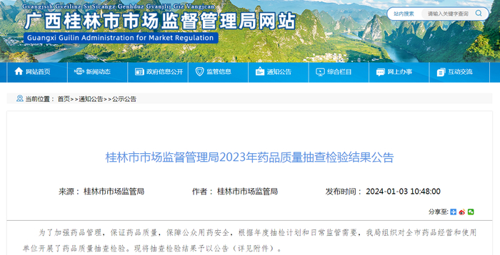 桂林市市场监督管理局2023年药品质量抽查检验结果公告