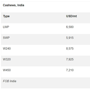 不过,该行业在2024年仍将面临一些困难。Samsons Traders的专家指出,俄乌冲突可能会继续影响市场,中东的情况也类似。红海危机目前造成了交货延误和高昂的运费,这里的局势将如何发展还有待观察。不过,总体而言,Samsons Traders也预计市场至少会保持稳定。然而,最近几周印度市场的价格略有上涨,印度腰果W320目前的离岸价格为7925美元/吨。(农产品集购网https://zixun.16988.com/编译整理,仅供参考。来源:Mundus Agri)