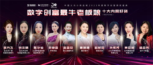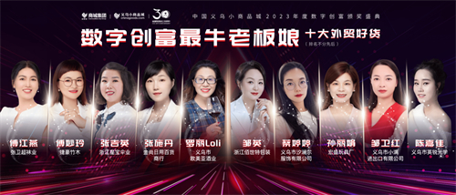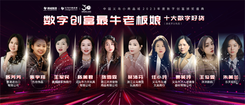 2023年末,为表彰并扩大这些数字创富老板娘的带头典范作用,义乌中国小商品城举办了一场轰动全球商贸行业的年度义乌数字创富老板娘大赛。经过多维度激烈的角逐评选,“义乌年度最牛老板娘”拨云见日,荣登大榜。在2024年的第10天,2023年度义乌中国小商品城数字创富颁奖盛典在义乌银都华悦酒店开展,为60个数字创富优秀企业和个人颁奖。