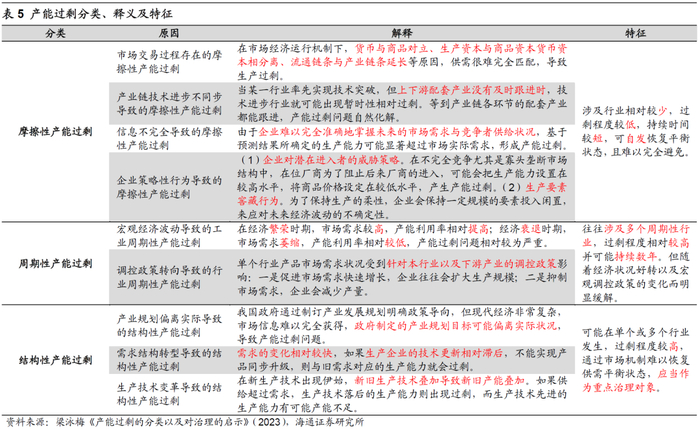 不同行业产能过剩的原因存在差异,对应的投资策略也就不同。在分析产能过剩背景下的投资策略时,部分投资者会认为大公司更容易存活下来,投资龙头是最好的选择。然而,不同行业出现产能过剩的原因各异,例如由周期性因素导致短期供过于求的产能过剩,也有结构性因素导致原有需求消失的产能过剩(详见表5定义)。正如前文所述,相比前一轮产能过剩集中在上游资源品,本轮产能过剩分布在中下游,因此投资者需要对不同行业产能过剩的原因进行具体分析,找到产能出清的突破口和相应投资机会。