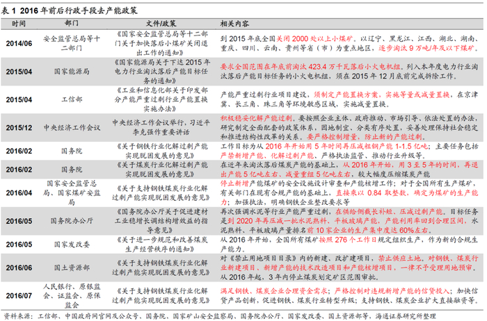 2016年前后政策采取行政命令的方式强制资源品企业关停产能。2016年前后,政府主导的去产能任务主要集中在煤炭、钢铁和水泥等传统工业领域,政府部门采取强制关停、淘汰和退出等行政手段促使产能显著下降,取得总量指标的阶段性改善。分产业看:煤炭业去产能从严控新增、淘汰落后、有序退出过剩产能三个方向展开。2014/06/05国家安全监管总局等十二部门提出到2015年底全国关闭2000处以上小煤矿。在国家任务目标下,据不完全统计,2015年全国各省1052处煤矿关闭产能达6391万吨。钢铁业通过严禁新增产能,引导过剩产能主动退出,化解产能绝对过剩。2016/02/01国务院《关于钢铁行业化解过剩产能实现脱困发展的意见》提出,2016年开始用5年时间再压减粗钢产能1-1.5亿吨。截至2016年11月末,全年压减粗钢产能4500万吨的目标完成。同年我国粗钢产量/消费量同比增速分别下滑至-14.3%/-13.5%。水泥业通过严禁新增产能、淘汰落后和错峰生产,压减过剩产能。2016/05/05国务院办公厅《关于促进建材工业稳增长调结构增效益的指导意见》提出,到2020年再压减一批水泥熟料产能,生产集中度CR10达60%左右。新投产水泥熟料产能由2012年的1.6亿吨大幅下降至2016年的0.3亿吨,此后基本维持不变;15-18年全国水泥产能保持同比负增长。