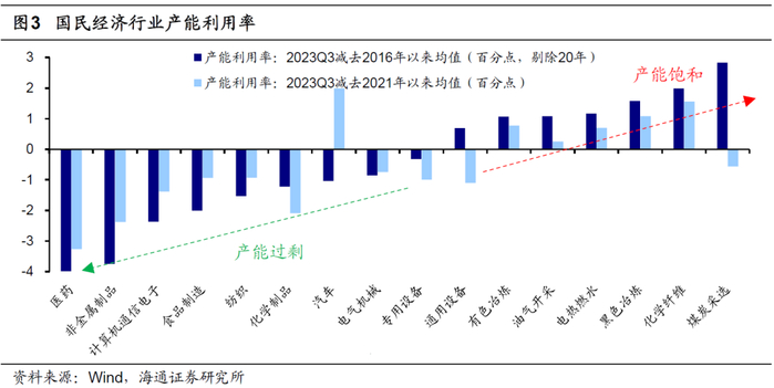 我国工业企业的产能利用率自21Q2的阶段性高点78.4%开始下行到23Q1的低点74.3%,此后有所回升,23Q3为75.6%,略低于13年来均值75.7%,更低于近3年均值76.1%,表明当前我国确实存在一定的产能过剩问题,这也能从PPI自22/10开始持续运行在负值区间可以看出。不过,整体而言,相对13-15年当前产能过剩问题较轻,彼时工业企业产能利用率一度下行至最低的72.9%,PPI负增长的程度和时间也更严重,而目前我国并未出现系统性的产能过剩。